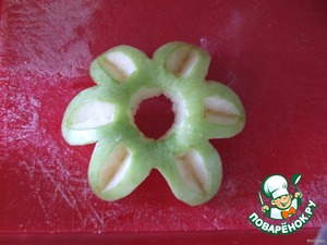 Теперь вырезаем по контуру лепестков лишнюю мякоть яблока, чтобы сделать вот такой цветочек. Потом в серединке прорезать дырочку.