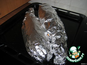 завернуть в фольгу и убрать в разогретую духовку(при t+140С), запекать 30 минут).