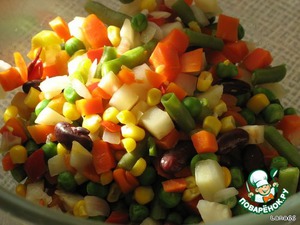 Состав: морковь, сладкий перец, стручковая фасоль, зеленый горошек, кукуруза, сельдерей, красная фасоль, лук.