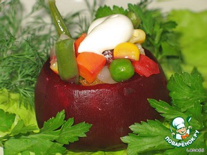 Лукошки сделаны из вареной свеклы и заполнены овощной смесью "MEXICO". Довольно неплохая вкусовая гамма. Закуска предлагается всем моим коллегам сайта и на конкурс "Овощной светофор".