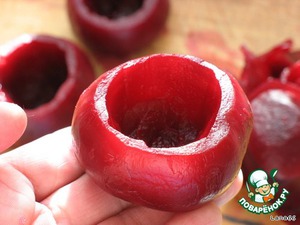 Свеклу отварить минут 40 и сразу залить холодной водой. Если свекла не достаточно сладкая, в воду добавить при варке 1 стакан сахара. Очистить, плоско срезать корешковую и верхушечную части, и очень аккуратно вырезать сердцевинку. Вырезанные части свеклы добавить в овощи.