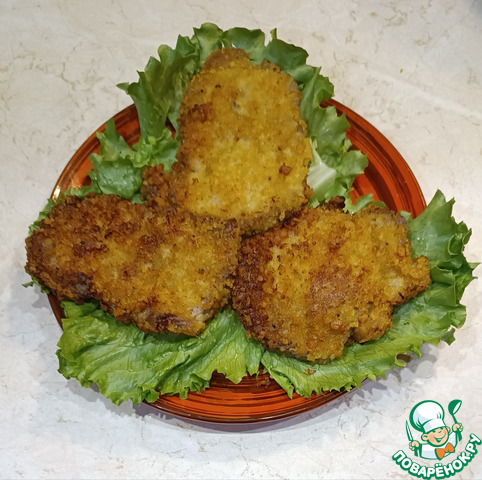 На разогретой с маслом сковороде жарим с двух сторон наши отбивные до золотистой корочки. Накрываем крышкой, убавляя при этом огонь, доводим до готовности.