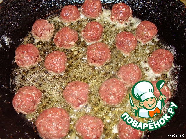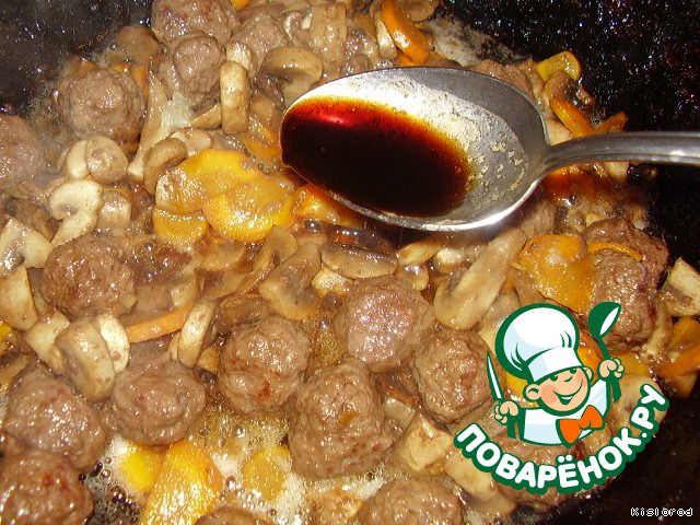Добавить к фрикаделькам, перемешать, продолжать обжаривать.