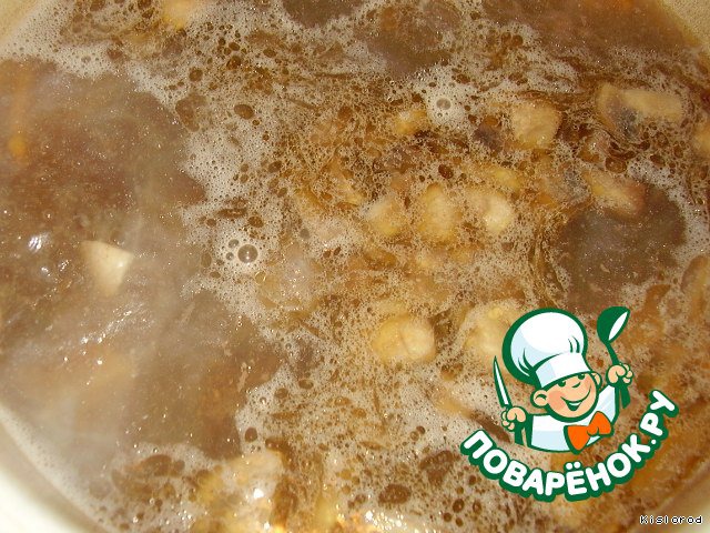 В кастрюле нагреть овощной бульон и поместить туда содержимое сковородки, довести до кипения и варить на слабом огне 10 минут.