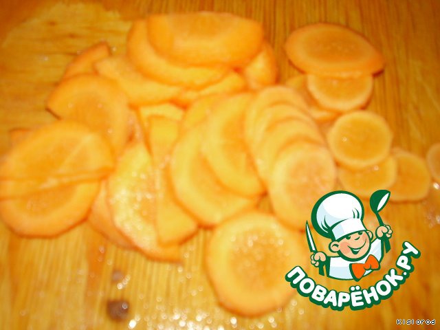 Морковь нарезать кружочками (если крупная, то полукружками).