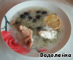 В тарелку накладываем по кругу: немного риса, мяска, кстати, в оригинале рецепт был без мяса, только на бульоне, но я готовила мужу на обед, а значит, надо было посытнее, маслинки. Заливаем всe это хозяйство бульоном и сверху выкладываем дольку лимона, любую зелень (у меня был только укроп) и ложечку сметаны. Подаем, не размешивая.