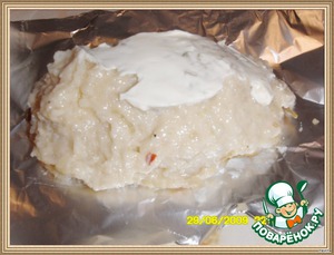 Сверху выложить второй частью пюре, и по-бокам завернуть фольгу..
