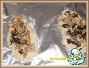 1/2 части разложить на фольгу, на него выложить пару ложек мясной начинки..