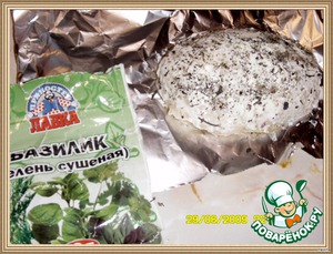 Сложить все рулеты на противень.. Верхушку смазать майонезом и посыпать базиликом...