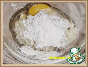 Добавить туда 1 яйцо и пол стакана муки. Хорошо перемешать.