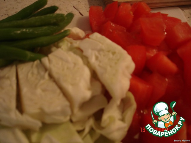Порезать морковь кольцами, лук кольцами, болг. перец небольшими кусочками, средний картофель на 4 части, приготовить фасоль, порезать помидор кубиками, капусту крупными кусочками