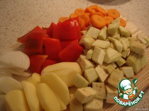 Порезать морковь кольцами, лук кольцами, болгарский перец небольшими кусочками, картофель на 4 части