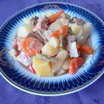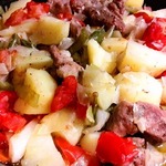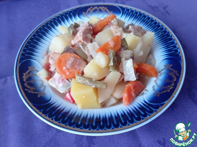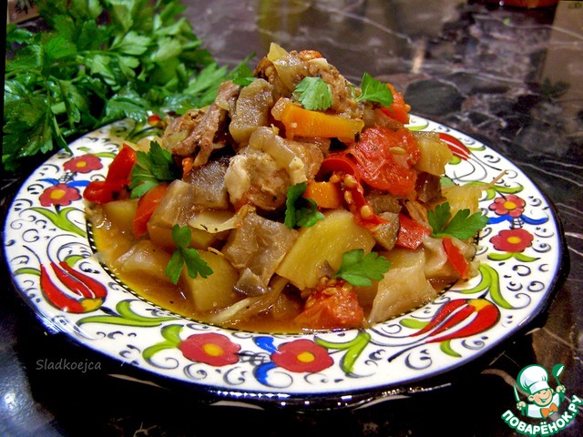 Масло довести до кипения и укладывать слоями: мясо (1 раз его перемешать), морковь, лук, картофель, перец, фасоль, помидор, капусту.
