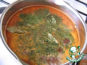 • Суп посолить, всыпать специи (хмели сунели, лавровый лист, сухие петрушка и укроп).