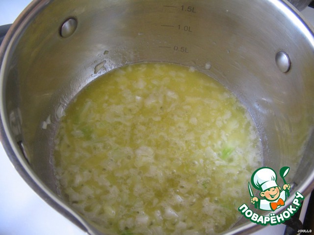 • Лук мелко порубить, положить в кастрюлю с растопленным сливочным маслом и, помешивая, прогреть в течение 3-4 мин.