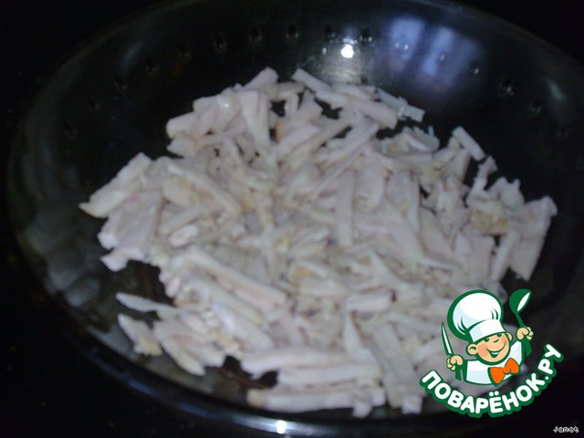 Ветчину порезать соломкой и уложить на дно салатника. Помазать майонезом.