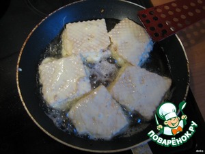 Делаем фарш как на котлеты, но не кладу яйца. Намазываю фарш на один круг вафли вторым закрываю. Режу круг на три части и каждую часть еще на три. Обмакиваю в смесь из яиц и майонеза, жарю на раскаленном масле, но на не большом огне, до золотистого цвета с двух сторон.