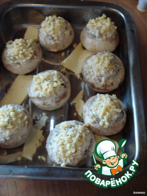 Этим фаршем начиняем шляпки грибов, посыпав сверху тертым сыром. На противень кладем сливочное масло и льем немного воды.
