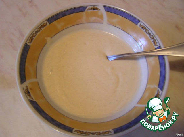 Смешать сметану, майонез, горчицу, добавить немного воды( 50 мл., но можно и не добавлять).