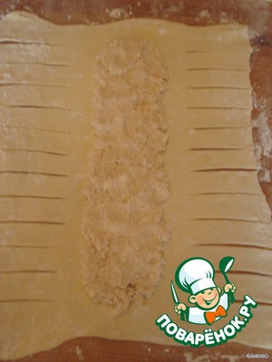 Раскатываем готовое слоеное тесто, надрезаем полосочками с обеих сторон, на середину выкладываем курятину с плавленым сыром.