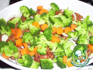Брокколи и морковь, порезанную кружочками, слегка отварить в слегка подсоленой воде. Отвар не выливаем.