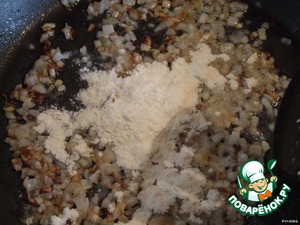 В него я положила соль и муку и все хорошо перемешала и немного пожарила, периодически помешивая.