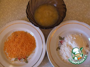 Берем две тарелки и одну миску. В тарелки насыпаем муку и панировочные сухари, а в миску яйцо и соль и немного взбалтываем.
