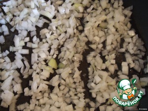Берем репчатый лук, очищаем его и мелко режем. В сковороду наливаем подсолнечного масла и жарим лук на максимальном огне, когда он приобретет золотистый оттенок, ставим огонь на минимум и пускай там жариться.