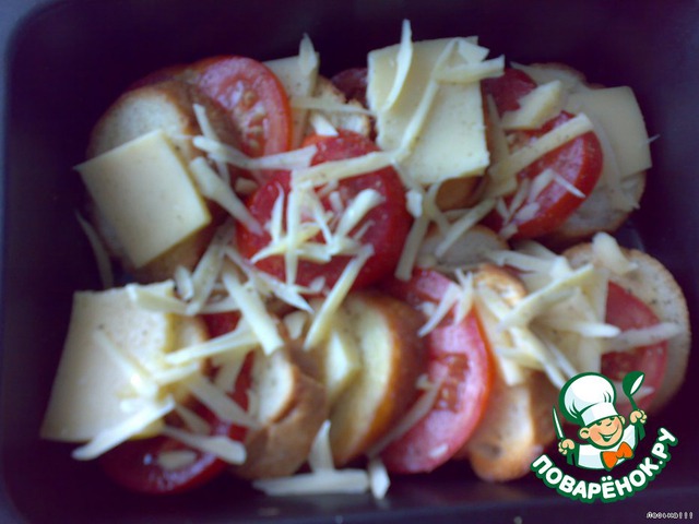 Форму смазываем маслом и выкладываем багет, сыр и помидоры, как черепицу. Сбрызгиваем маслом, посыпаем перцем, тертым сыром (слегка) и отправляем в разогретую до 180гр духовку на 10 мин.