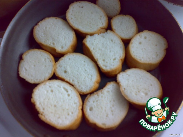 Все легко и просто. Багет режем на кусочки. Обжариваем их на оливковом масле