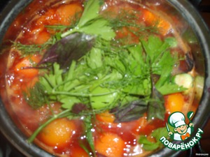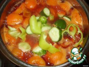 Покипело трио из морковки, абрикоса и вишенок - кладём к ним огурцы и перец.