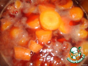 Фотографировать начала не сначала, забыла уже совсем про это. В кастрюленции уже закипают морковка, порезанная кружочками, вишня без косточек, абрикосы без косточек. Разумеется, перед варкой всё заливается водой, чтобы просто покрыть.