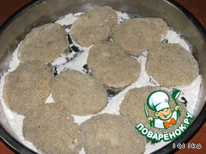 Из этого количества фарша у меня получилось 32 котлеты, так что придется замораживать. На дно блюда насыпала муки, чтобы не прилипло. -