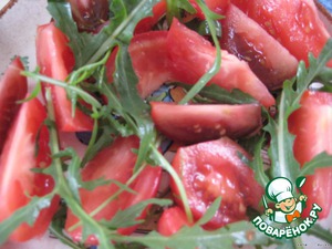 помидоры нарезать крупными кусочками, добавить рукколу. -