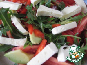 Добавить салатный перец, нарезанный тонкими полукольцами и авокадо, нарезанный крупными кусочками;