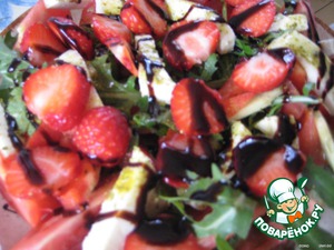 Добавить кусочки клубники и, по желанию - бальзамический уксус или соус.