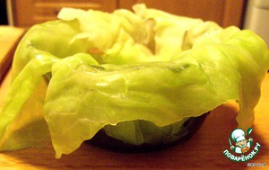 Берем 4 стеклянные огнеупорные формы ( у меня они объемом 200 мл)и выкладываем форму капустными листами, так чтобы их края слегка выступали.