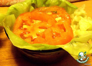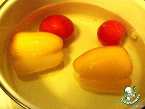 ... помидоры и перец 2-3 минуты. Достаем из воды, остужаем. У капустных листьев срезаем все толстые места. С помидоров и перца снимаем шкурку. Перцы нарезаем кусочками (произвольно), помидоры - колечками.