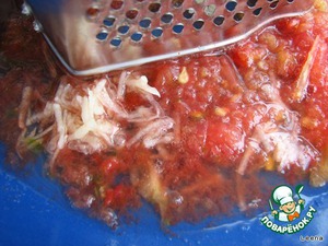 • 3 средних помидора натрем на крупной терке таким образом, чтобы шкурка осталась в руке. На мелкой терке трем чесночок.