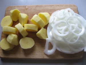 Нарезать картошку ломтиками 1-1,5 см, посолить, поперчить (можно картошку предварительно отварить до полуготовности, тогда время ее пребывания в духовке несколько сократится), лук нарезать кольцами.