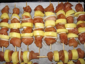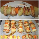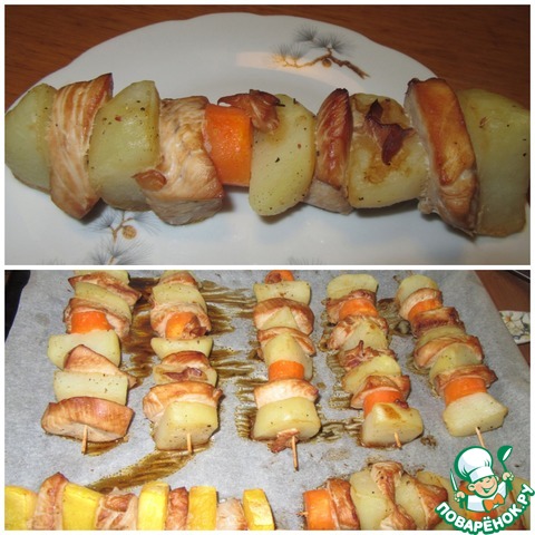 Надеть все на шпажки, выложить на лист, поставить в разогретую до 180-200*С духовку и забыть на 1 час.