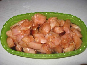 Индейку нарезать крупными кусочками и замариновать в соевом соусе на 30 минут, периодически перемешивать.