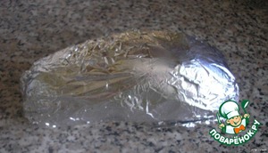• Баклажан моем, вытираем, заворачиваем в фольгу. Разогреваем духовку до 200 градусов и запекаем баклажан 20 минут.