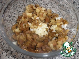 • Даем баклажану остыть. Очищаем его и очень мелко режем. Добавляем измельченный чеснок, сок из лимона, зиру, масло и соль.