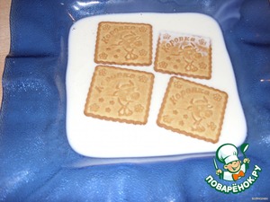 Печенье, буквально на секунду, обмакиваем в молоко и выкладываем в форму для нашего тортика.