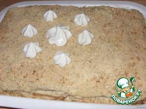 Верхний слой тоже смазываем кремом и посыпаем измельчённым печеньем или на ваше усмотрение, кому как нравится.