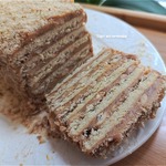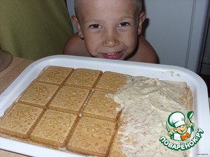 Укладываем слой печенья и наносим нетолстый слой крема, затем ещё слой, и так до конца.