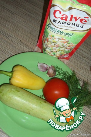 Пожаренные кабачки смазываем чесночным майонезом, на край выкладываем по кусочку помидорки и перчика желтенького.