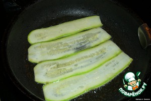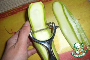 Кабачок нарезать вдоль пластинами тоненькими, я пользовалась ножом для чистки овощей, но можно и обычным ножом нарезать.Посолить.