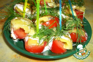 Сворачиваем рулетиком, сверху добавляем зеленушку и прокалываем шпажкой.Готово!